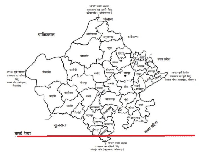 - उत्तरतम बिन्दु: कोणा गाँव, श्रीगंगानगर ($30^\circ 12’$ N)।
